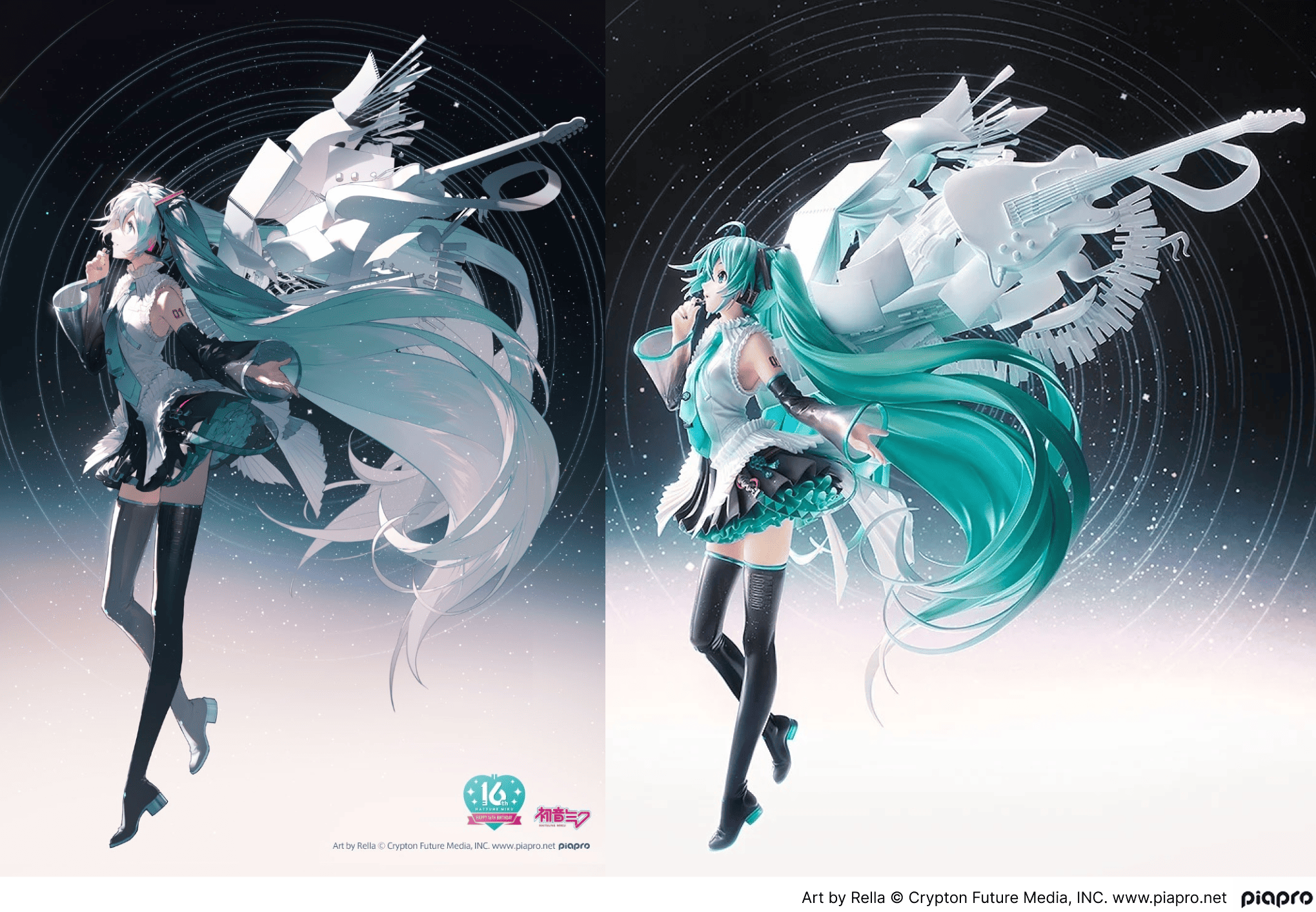 この場合、ファンの手元に届いたことを考えながら頭の中で一度光の演出を取り除きました。かつ、16周年にミクさんの設定年齢が追いついた「16歳の誕生日」をテーマにしたイラストだったので、後ろに背負っている「創作の羽根」の解釈も、各部署と何度も話し合いを重ねながら精緻に再現しています。エメラルドグリーンがかったホワイトを施したのですが、髪の色や洋服と重複しないように心がけました。
