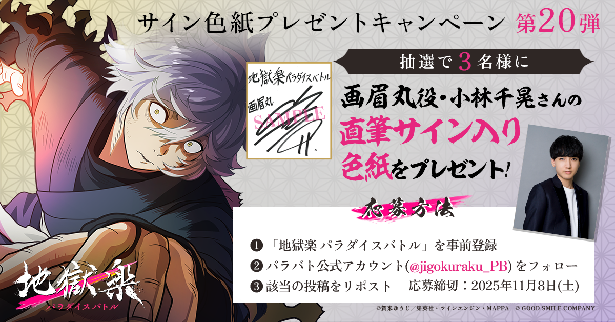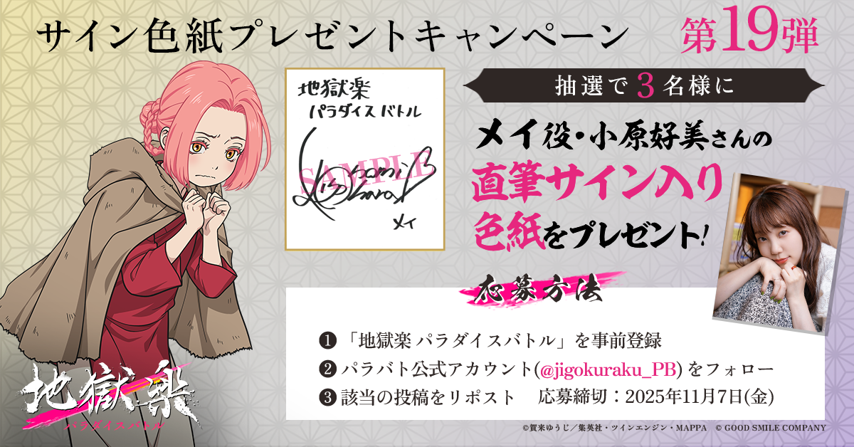 『地獄楽 パラダイスバトル』出演キャストの直筆サイン入り色紙、キャラクターイラストを使用したアクリルスタンドが当たるプレゼントキャンペーンを実施しております。